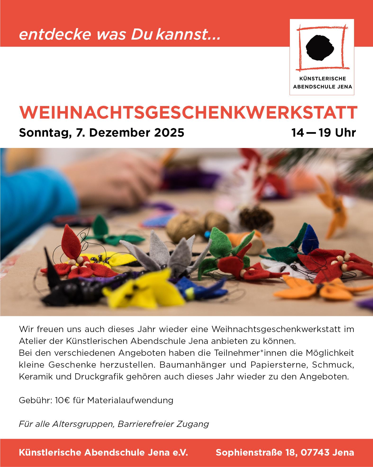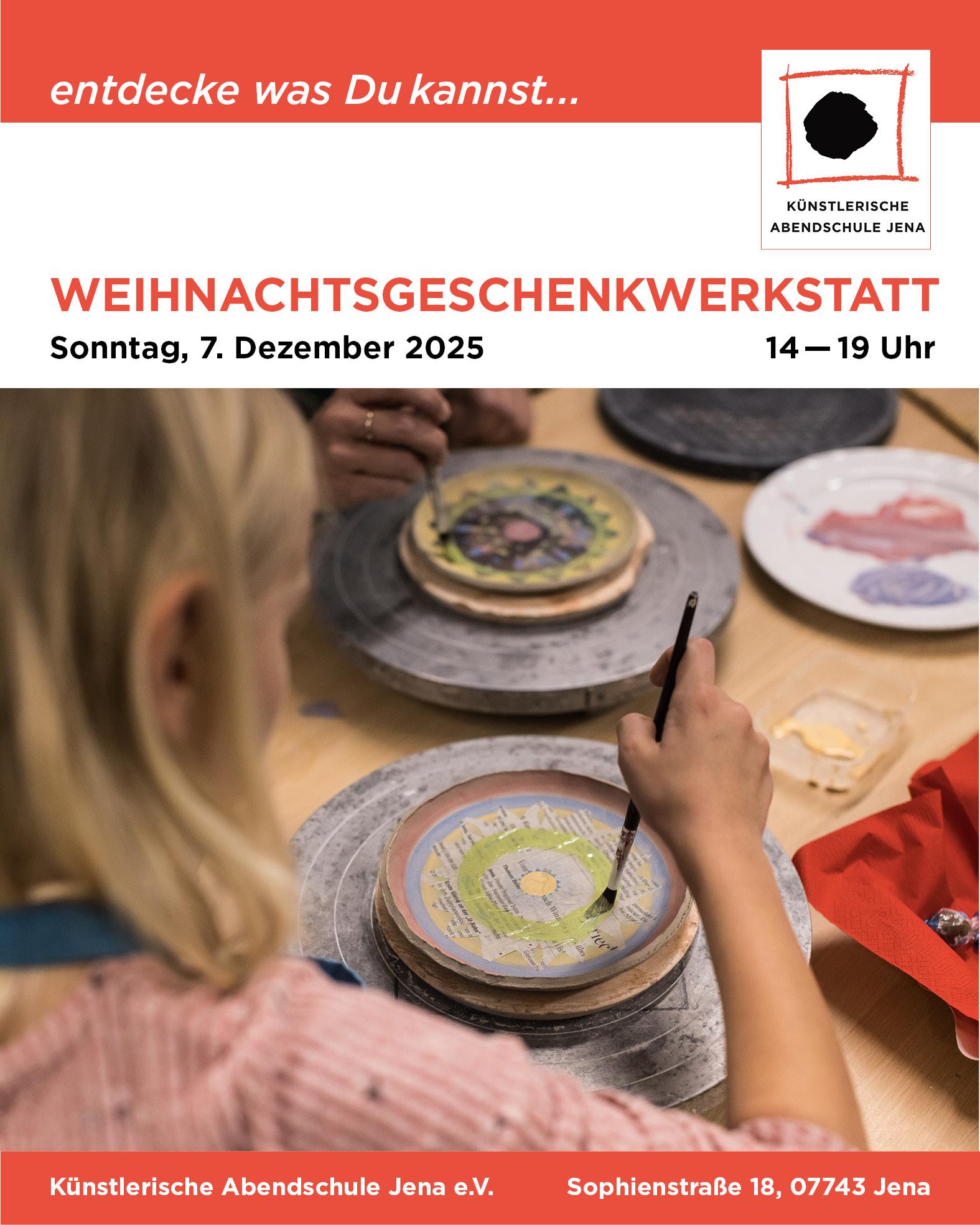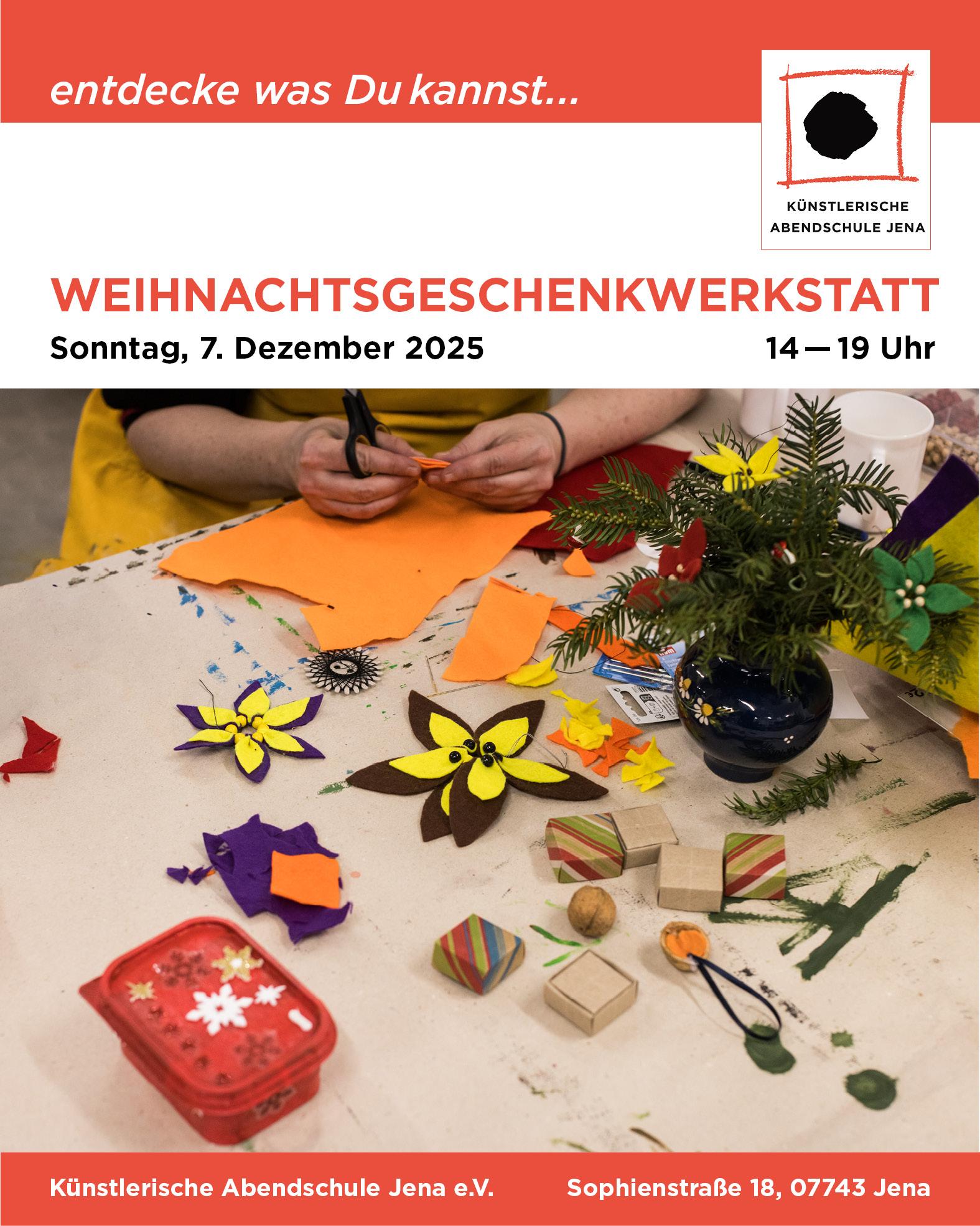 Wir freuen uns auch dieses Jahr wieder eine Weihnachtsgeschenkwerkstatt im Atelier der Künstlerischen Abendschule Jena anbieten zu können.